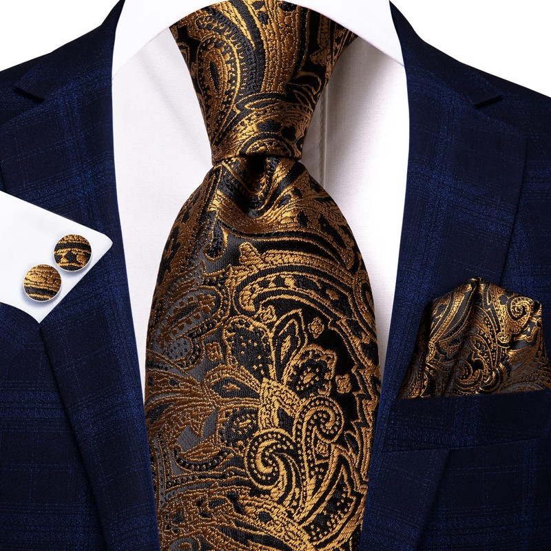Hi-Tie Silk Paisley Ties for Men Necktie Pocket Square Cufflinks Set Foral Tie Sets Formal Business,Gold Paisley