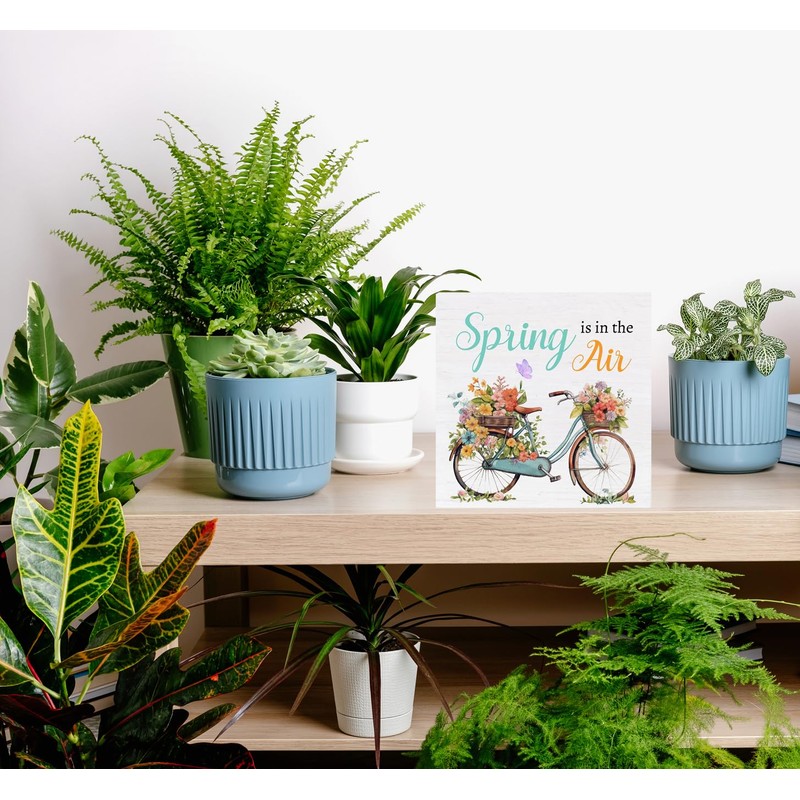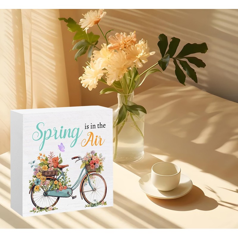 Hiagkmet Spring Wooden Sign, Farmhouse Spring Is in the Air Bicycle Wood Sign Home Living Room Table Desk Decor 5 x 5 Inches