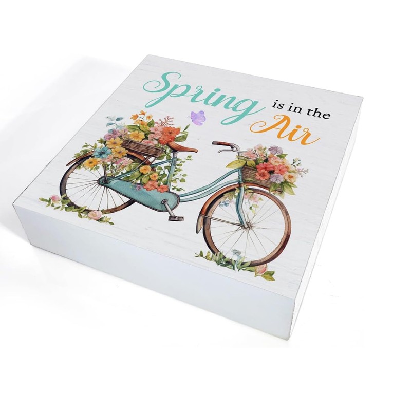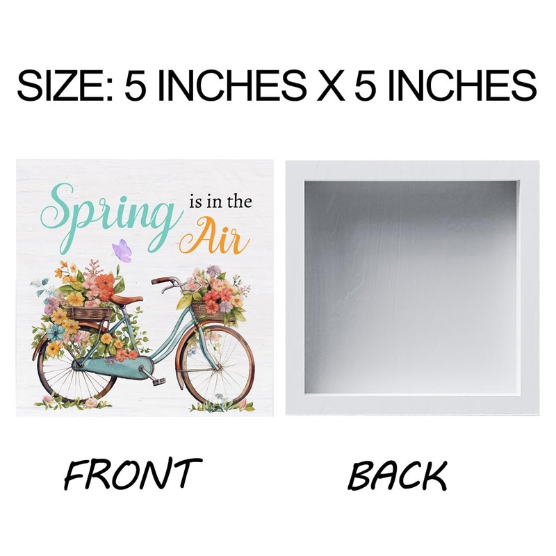 Hiagkmet Spring Wooden Sign, Farmhouse Spring Is in the Air Bicycle Wood Sign Home Living Room Table Desk Decor 5 x 5 Inches
