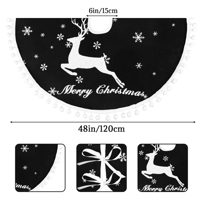 - Merry Christmas Tree Skirt:Our Christmas tree skirts is printed with elk and various sizes of snow patterns, as well as the words "Merry Christmas." The edges are adorned with small, fluffy balls, adding a festive touch to your Christmas tree. This 48-inch tree skirt is perfectly sized for medium-sized Christmas trees