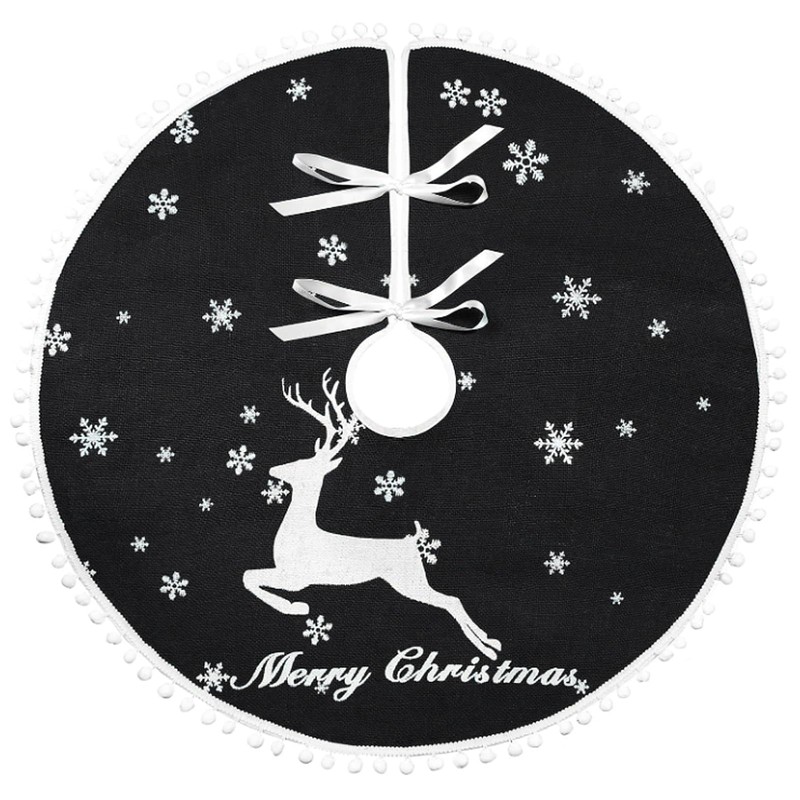 HIAGROW 48 Inch Christmas Tree Skirt, Burlap Black Christmas Rustic Tree Skirt with Elk Deer and White Snowflake Printed for Holiday Party Xmas Tree Decoration