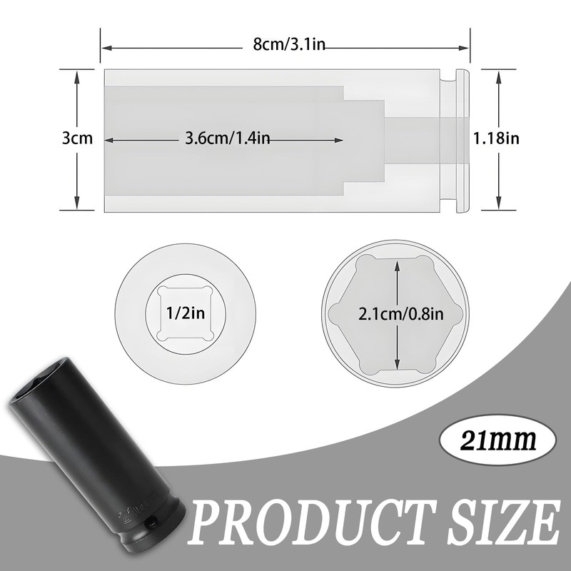 - Versatile】: 1/2-inch drive 21mm deep impact socket are designed for use with power impact spanners or drivers. Can be used to remove or install axle nuts. Ideal for maintenance of all types of fasteners on vehicles, plumbing repairs, mechanical repairs.