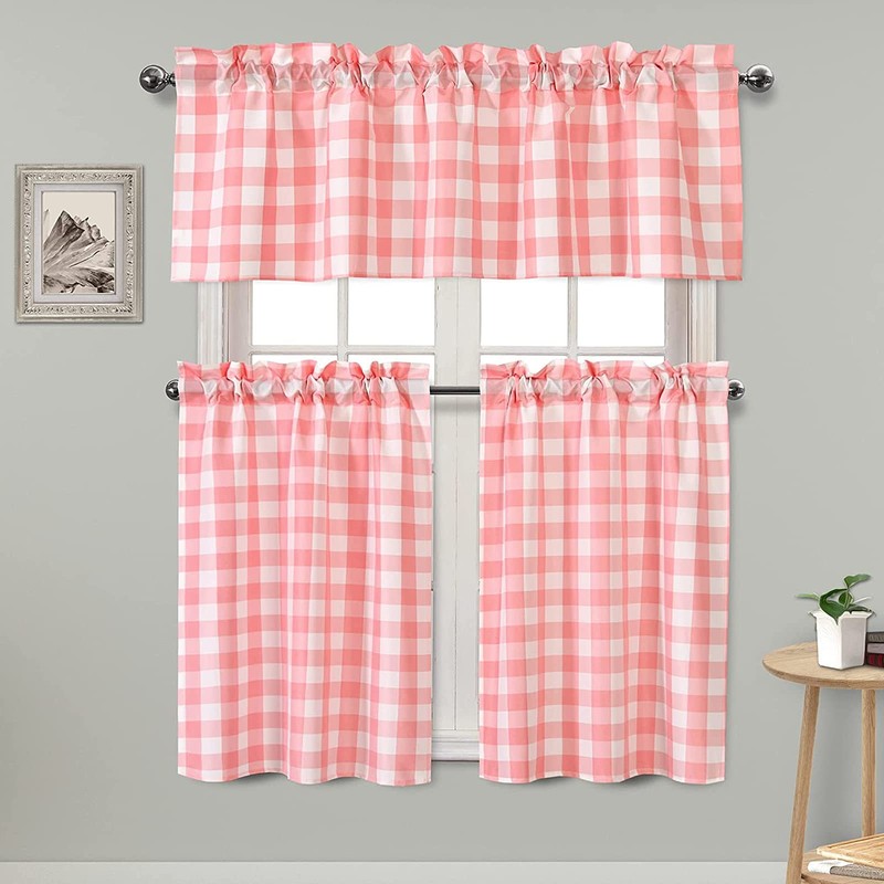 Hiasan 3 Piece Semi Sheer Plaid Kitchen Curtains Light Filtering Buffalo Checkered Tier and Valance Curtains Set, Pink
