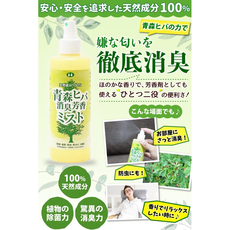 • This deodorizing spray is formulated with Hiba Aomori containing a wide variety of active substances including Hinokiol and Hiba