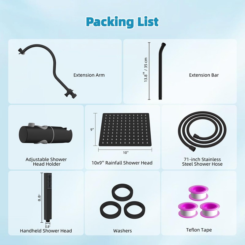 • 10x9'' Rainfall Shower Head: This improved SUS304 stainless steel rainfall shower head combines lightweight construction with sturdy, rust-resistant quality. Its ultra-thin, elegant design, enhanced with air-in technology, delivers a luxurious rain spray through 110 splash jets. The upgraded 10x9'' size not only significantly improves water pressure for a more powerful, revitalizing shower but also offers better support and stability on the shower arm, providing a superior shower experience with less weight and greater comfort