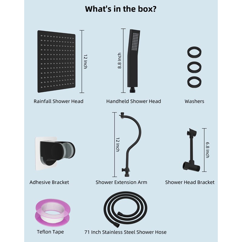 • Shower Head Combo: Hibbent shower combination comes with a 12-inch large square rain shower head, handheld shower head, 71-inch metal stainless steel shower hose, 12-inch shower head extension arm, adhesive shower head holder, shower head bracket, washers, Teflon tape, and installation manual. All metal stainless steel and solid brass extra long 71-inch shower hose is made of odorless EPDM material that can be used in a high-pressure and high-temperature environment.