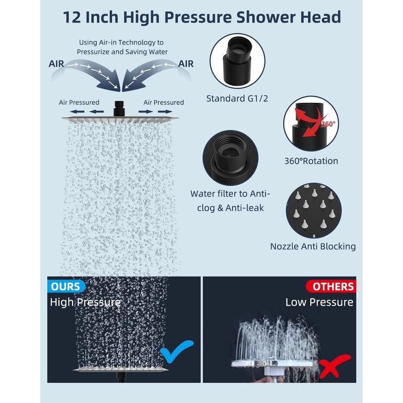 • 12'' Metal Large Shower Head: 12'' large rainfall all-metal square shower head body is made of SUS 304 stainless steel certified to ensure rust resistance, durability, and long service life. Combined with an ultra-thin design with air-in technology, the large shower head has 196 splash jets that deliver rain spray. The brass swivel ball connector adjusts the shower head to any angle you want to enjoy a relaxing hotel-style bathing experience.