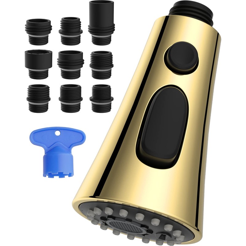 Hibbent 3-Function Pull Down Kitchen Faucet Head Replacement with 12 Adapters, NSF/ANSI/CAN 61 & CUPC Certified Sink Spray Nozzle, Compatible with Moen, Delta, Kohler Faucets, Polished Brass