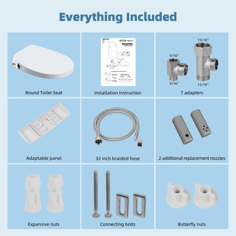 - 【No Electricity or Plumbing】Simple installation with no specialized tools required. Hibbent bidet toilet seat contains toilet seat x 1, 32 inch stainless steel braided hose x 1, 9/16'' (3/8'') metal T-adapter x 1, 15/16'' (7/8'') metal T-adapter x 1, rubber washers, additional replacement nozzle x 2, and instruction x 1. The upgraded Bidet toilet seat can be installed in less than half an hour, just like a regular toilet seat.