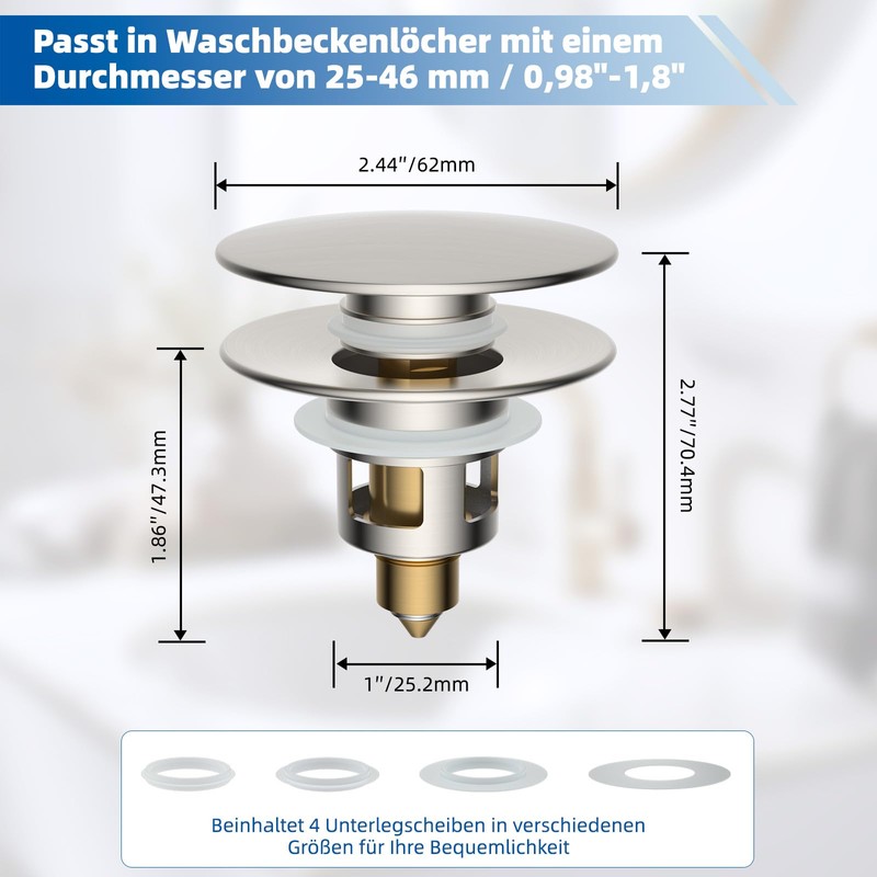 Hibbent Universal Sink Plug (25-46 mm), Elegant Brass Spring Core Pressure Valve, Pop-Up Drain Strainer Plug for Sink, Replacement for Bathtub and Kitchen Sink Plug, Brushed Nickel