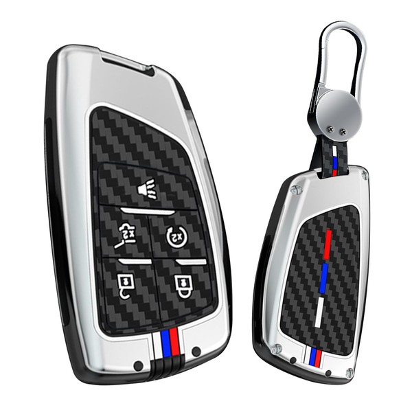HIBEYO Key Fob Cover Compatible with Buick Envision Avenir 2025 Fit for Chevy Suburban Tahoe Fit for GMC Yukon Denali Sierra Silverado Alloy Carbon Fiber Key Shell with Keychains-5 Button Silver