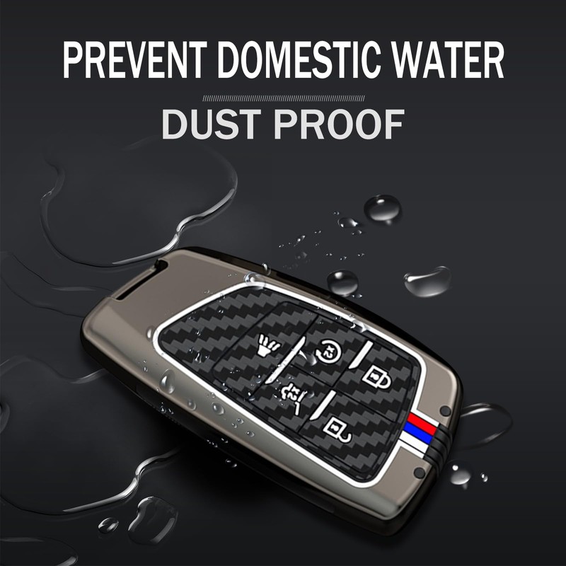 - 【Material & Design】:Zinc alloy shell is strong and durable;Carbon fiber texture pattern, fashionable and high-end; the 3D tactile silicone buttons are comfortable to press, soft, wear-resistant and dirt-resistant; the three red, white and blue lines on the key shell will emit fluorescence at night, Helps us find our keys quickly in total darkness (the light bar is made of fluorescent or phosphorescent materials, which needs to absorb energy from external light sources)