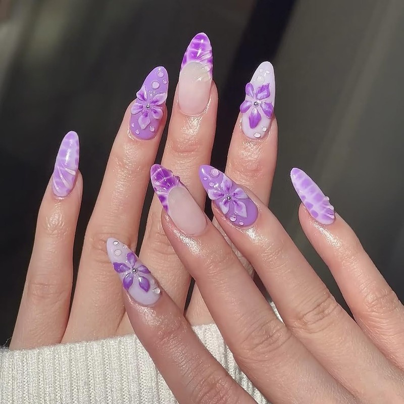 Hibiscus Purple Press on Nails Medium Almond Fake Nails 30Pcs, Summer Beach Pearl Flower Design Purple French Nails Press ons Cute Stick on Nails Rhinestones Nails for Women Daily Wear