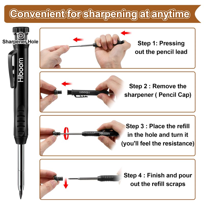 Hiboom 4 Pack Carpenter Pencils Set with 24 Refills, 2.8 mm Mechanical Carpenter Pencil Built in Sharpener Woodworking Marking Tool Solid Long Nosed Deep Hole Construction Pencil (Black)