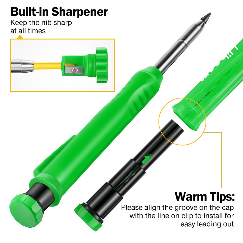 - Mechanical pencil: the carpenters pencil do not slip out of the fingers and repetitive tracings cause less pain; The pen clip design can be easily attached to the pocket, easy to use and not easy to lose, gaining in efficiency, proper for construction and bricklayers