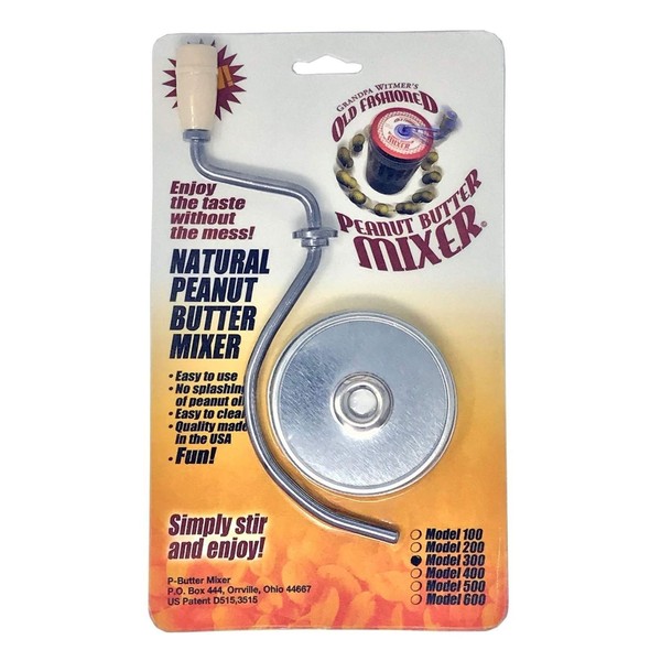 HIC Kitchen's Grandpa Witmer’s Natural Peanut Butter Mixer (model 300) stirsin the separated oils from natural peanut butter without splashing or makingan oily mess. Non-hydrogenated peanut butter is considered a healthier choiceover those that are hydrogenated. However, dealing with the natural oils thathave separated can be a messy nuisance. This innovative must-have of kitchengadgets solves the issue by easily blending oil back into the peanut butter,right in the original container without splashing. This godsend for naturalpeanut butter enthusiasts makes it possible to enjoy natural peanut butterwithout an oily mess! Specially designed for a vigorous stirring with a smoothand even rotation. The knob spins freely to turn the crank while the mixingrod churns inside the full length of the jar, blending its contentsthoroughly. Once peanut butter is mixed, a flexible gasket inside the lideffectively cleans the mixing rod when it’s drawn out from the jar while aliner inside collects excess peanut butter. An easy-release tab allows theliner to be removed for an effortless and thorough cleaning. Easy to use.Simply remove the peanut butter jar’s lid and replace it with Grandpa Witmer’sPeanut Butter Mixer. Insert the mixing rod through the mixer lid opening andturn the handle clockwise with a downward pressure. Hold the jar eitherupright or sideways and continue to mix until oil is thoroughly blended backinto the peanut butter. Pull the knob upward to remove and clean the mixingrod. Unscrew the mixer lid from the jar and replace the jar’s original lid.Pull the release tab to pop out the mixer’s lid liner and white gasket forcleaning. Proudly made in America from chrome plated steel and BPA-freeplastic lid, Grandpa Witmer’s Old Fashioned Peanut Butter Mixer fits 16-ouncejars with 2.75-inch lids. Hand wash all parts in warm, soapy water.