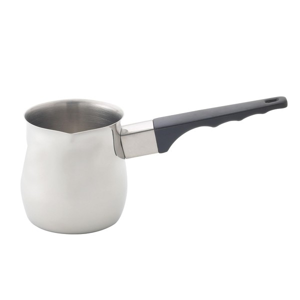 With this stainless steel pot you can warm liquids such as milk and cream, or melt butter and warm gravy. The heat resistant handle is contoured for a nice grip and does not transfer heat. It's durable, so whether you need it for preparing that holiday feast, melting butter, heating sauces or to melt just a bit of butter for popcorn on family movie night, the HIC Turkish Coffee Warmer and Butter Melting Pot will be there, ready to tackle any job. 12 ounce capacity. Dishwasher safe. Measures: 3.38-Inches in diameter at widest point (w/out handle) 3-Inches in diameter at the opening 3.5-Inches high 8-Inches from the tip of the handle 2.75-Inches on the bottom