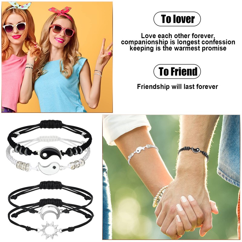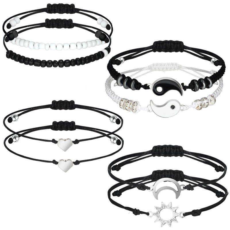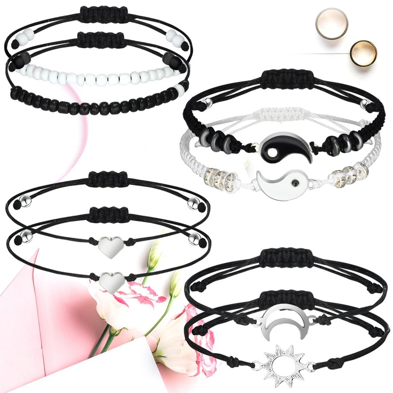- What you get: there are 4 sets of 8 piece adjustable couple cord bracelets, namely sun and moon shape pendent bracelets, white heart shaped pendent bracelets, white and black beaded bracelets, enough quantity and rich style to meet your needs of wearing and matching, give you different wearing effect