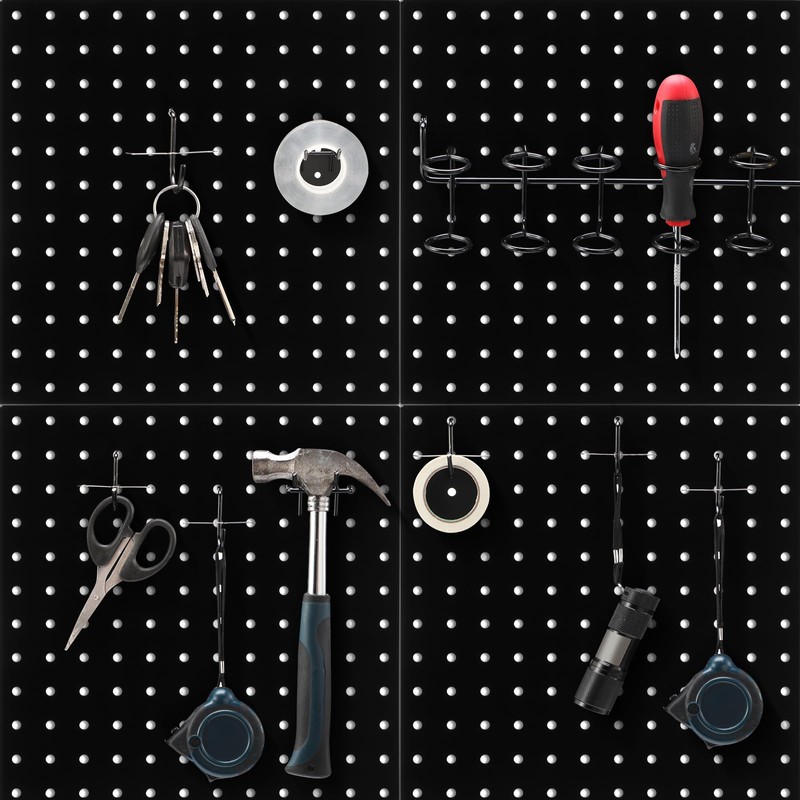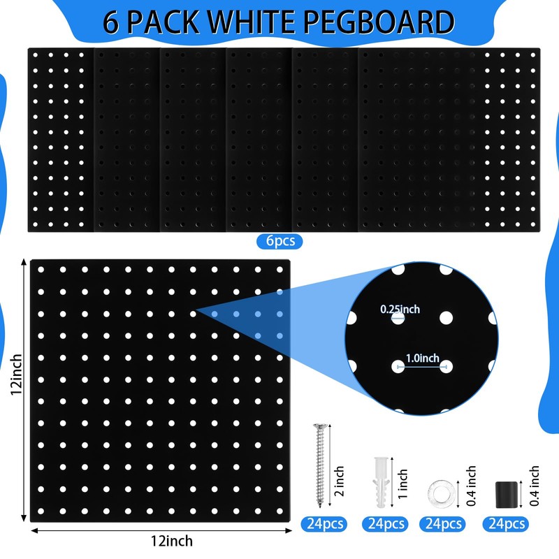 - Decoration and Flexibility: the black and sleek design of the peg board hooks organization will complement many spaces from the garage to the craft room, making them stylish additions to your home or workplace; The pegboard measures approx. 12 x 12 inches/ 30.5 x 30.5 cm and the 6 pieces can be spliced together to create various sized pegboard display areas; If you want to use it in your garage or other places where you need a bigger peg wall, you can buy more sets to DIY your storage area