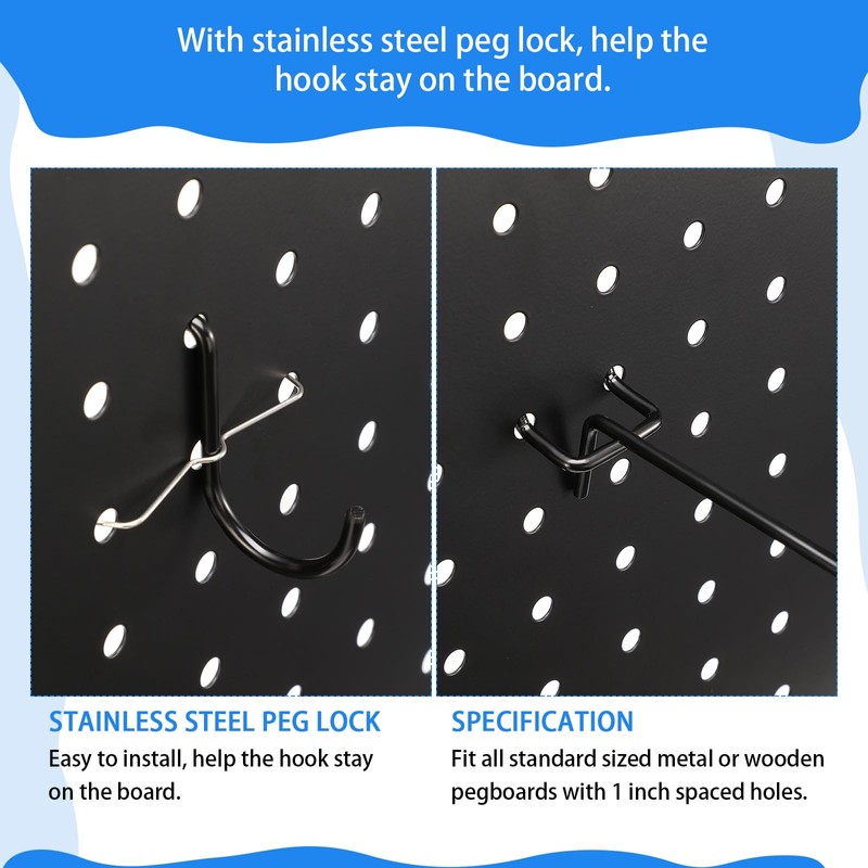 - Dependable to Serve You: the steel pegboards and pegboard hooks are made from quality metal that are durable and rust resistant, making them stronger than traditional pegboards and ensuring long lasting use; Simply clip onto the nail hooks and lock into the pegboard holes on either side to help secure the hooks to the board; Don't worry about damaging your tools when you pick them up or store them