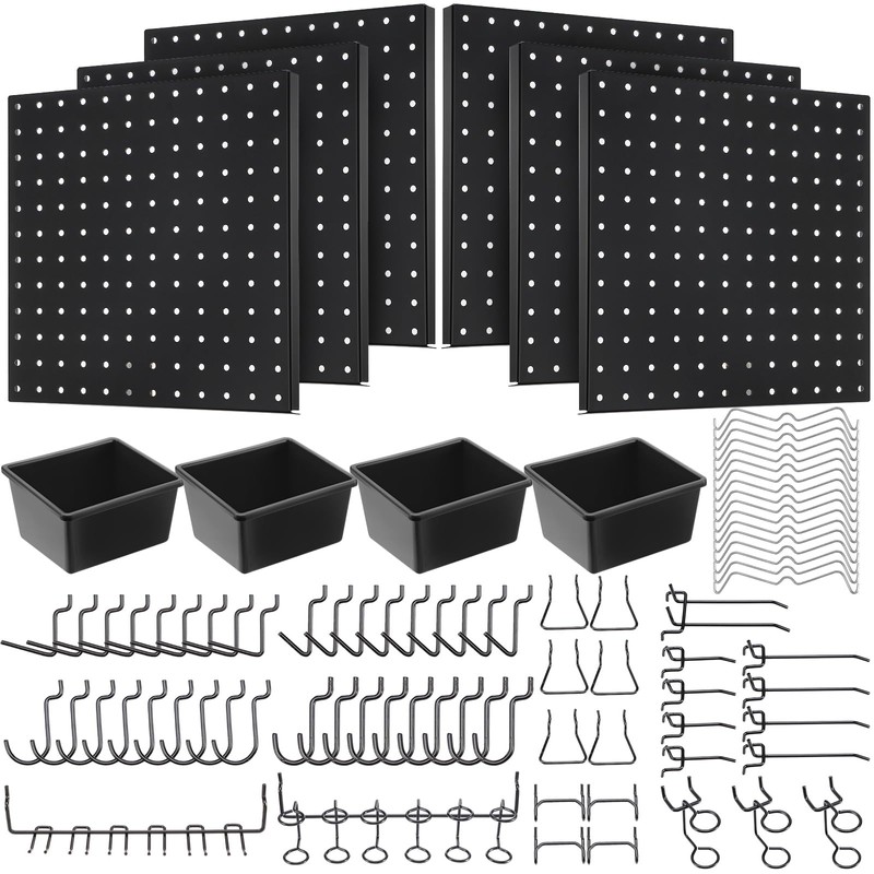 - Nice Combination: there is a 90 pieces pegboard hooks assortment with pegboard bins kit for freeing up workspaces and keeping tools neatly organized (tools not included), including 6 metal pegboards, 80 hooks in various shapes and lengths, and 4 storage cubes with standard 1/4" peg edge holes for universal pegboard hooks and accessories, fulfilling most of your storage needs