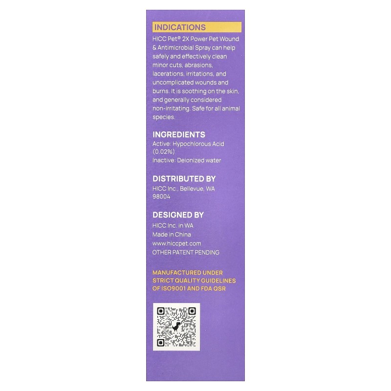 Recommended by Veterinarians Cuts Abrasions Lacerations Irritations Minor Burns Sores First Aid Instant Itch Relief Soothing No Alcohol Safe If Licked One-Step Cleansing Action Instant Itch & Redness Relief All-Natural Formula, Non-Stinging 360º Spraying Option Super Fine Mist, Continuous Spray Purified Hypochlorous Acid 0.02% Aids Skin Repair HICC Pet® 2X Power Pet Wound & Antimicrobial Spray can help safely and effectively clean minor cuts, abrasions, lacerations, irritations, and uncomplicated wounds and burns. It is soothing on the skin, and generally considered non-irritating. Safe for all animal species.SUGGESTED USE: