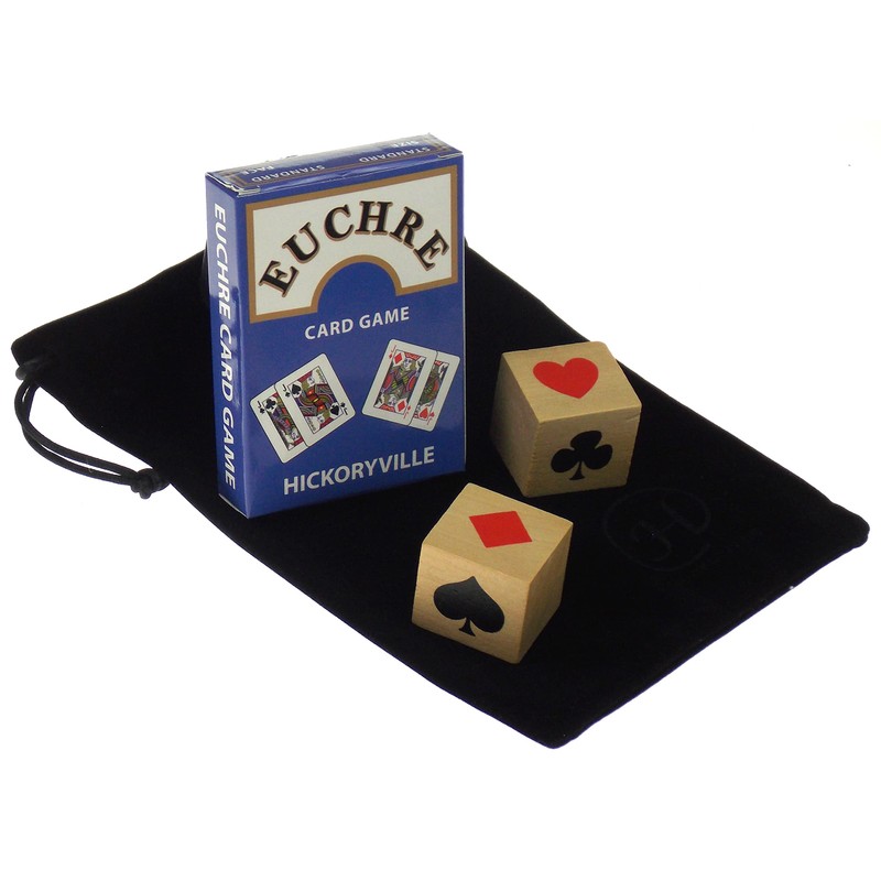 - Bundle Includes: 2 Decks Euchre Packed in One Box, 2 Trump Suit Marker Dice & 1 Velour Drawstring Bag.
