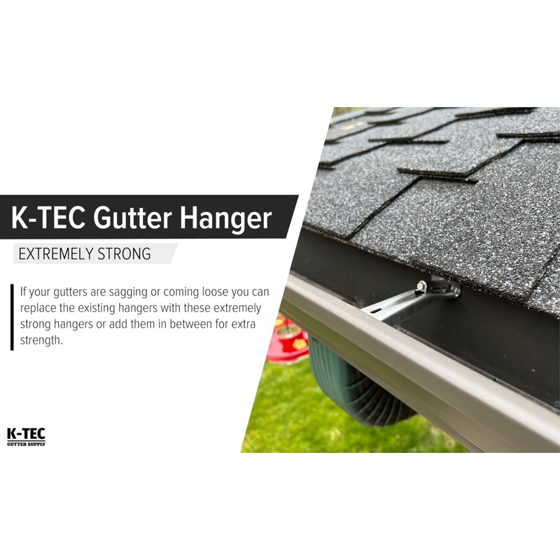 - Designed for the Outdoors: K-TEC screw in hangers for gutter repair are made in USA from high-strength, weather-resistant aluminum; Each one comes equipped with a built-in clip and pre-assembled rust-resistant screw for added convenience