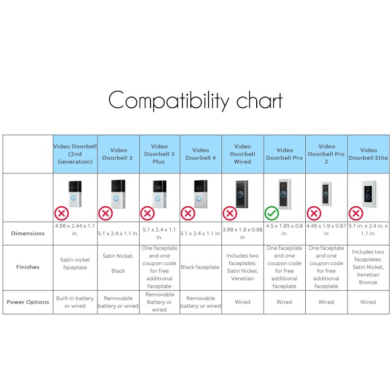 Won’t fit Ring PRO2.Important NOTES: Actual color can slightly differ due to lighting conditions and monitor calibration. Screws or doorbell are not included in the listing. Comes with machine screws to secure back plate and face plate together.