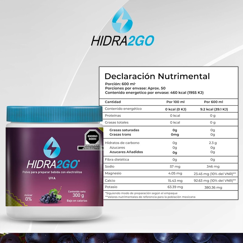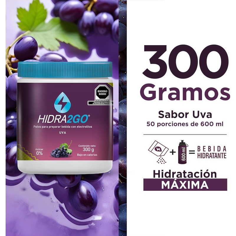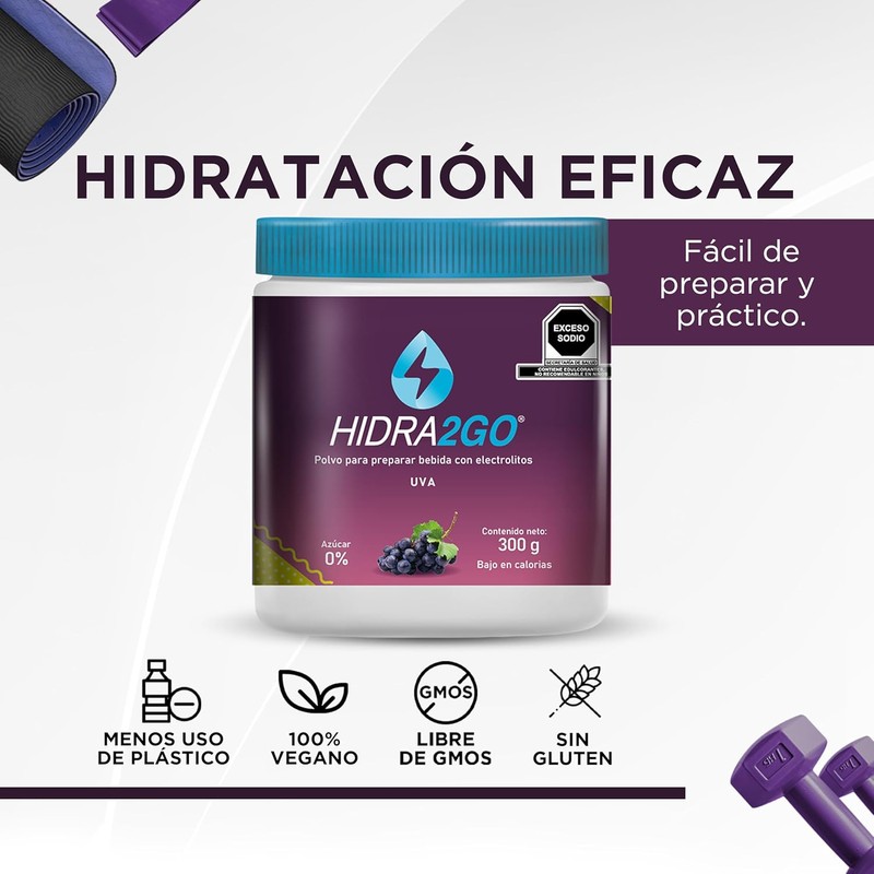 HIDRA2GO | Electrolitos Sin Azucar en Polvo 300gr - Sabor Uva | Pre Workout Hidratación Efectiva | Electrolit Pre Entreno Suplementos Gym | Sin Calorías Vegano y Ecológico