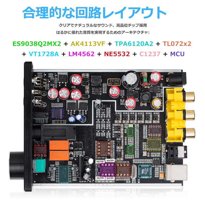 - With reasonable circuit layout and concise wiring, the sound is clear and natural. It adopts high quality chip architecture to achieve a much better sound quality. Adopting dual ES9038Q2M decoding chips, each one takes one channel, far better dynamic and isolation, allowing you to reproduce like real live music at higher resolutions