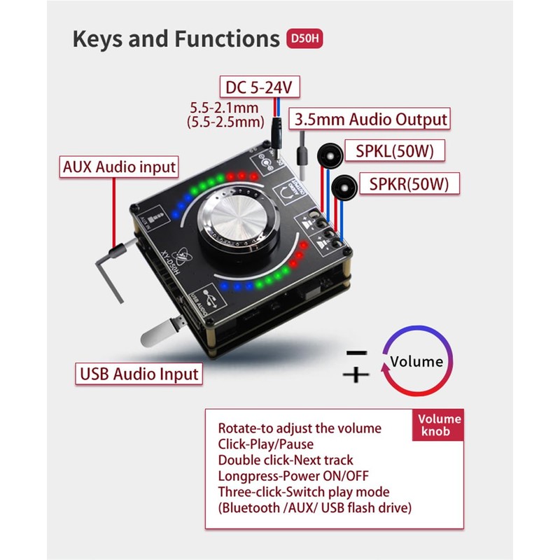 - 【Multiple audio input methods】The multiple input methods (Bluetooth, AUX, USB flash drive, USB sound card) allow for a wide range of devices to be connected to the amplifier board, including smartphones, laptops, tablets, and other audio sources.【Protective Function】Over-voltage Protection, Under-voltage Protection, Over-heat Protection, Short-circuit Protection, This means that the Bluetooth amplifier board is not easily damaged