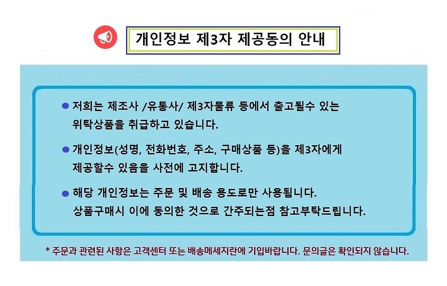 본 제품을 구매하시면 원활한 배송을 위해 꼭 필요한 고객님의 개인정보를 (성함, 주소, 전화번호 등) 택배사 및 제 3업체에서 이용하는 것에 동의하시는 것으로 간주됩니다.