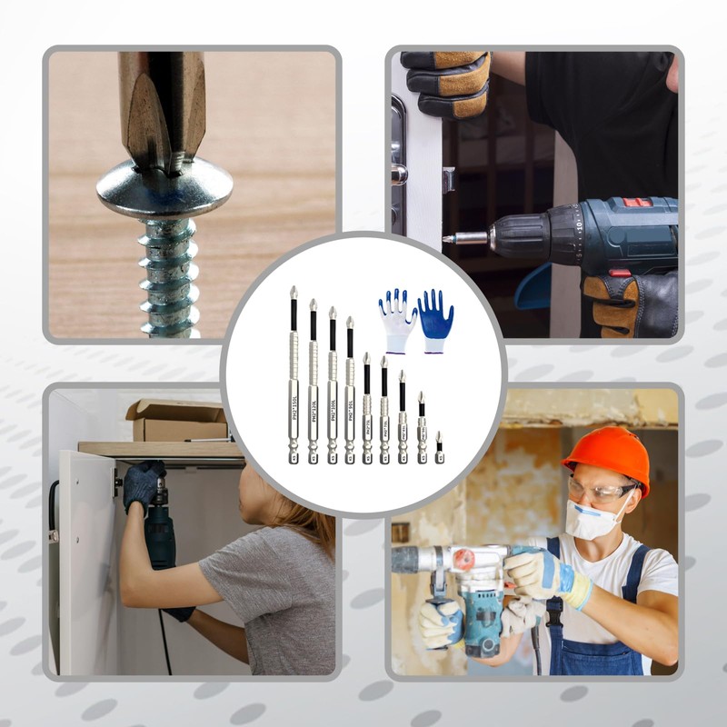 High Magnetic Screwdriver Drill Bit Set, 9pcs Impact Driver Bits and A Pair of Gloves with Anti-Slip Hex Shank, Compatible with Most Electric Drills and Screwdrivers, Versatile for Various Materials
