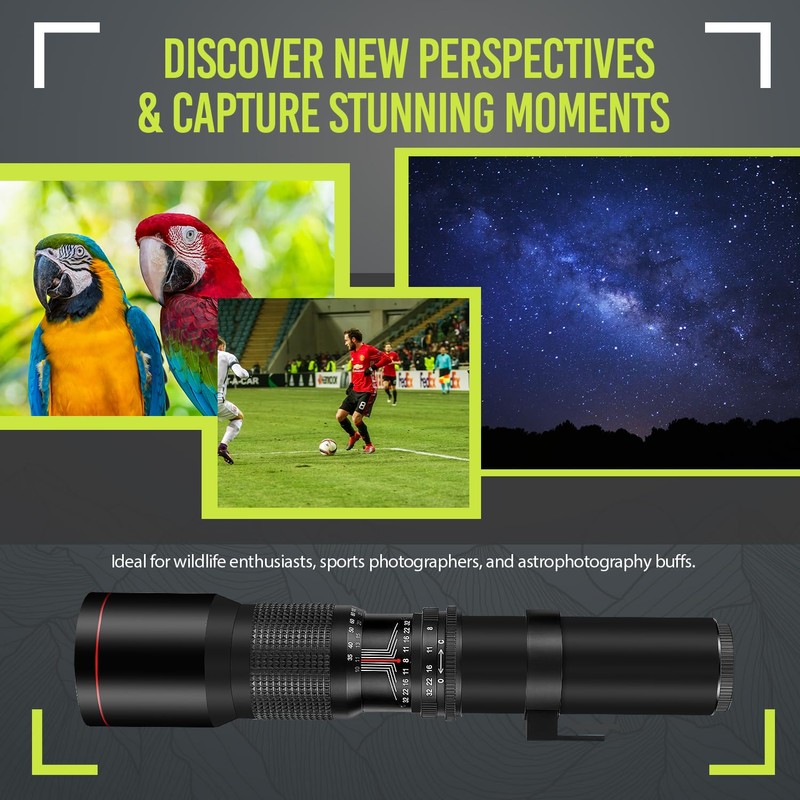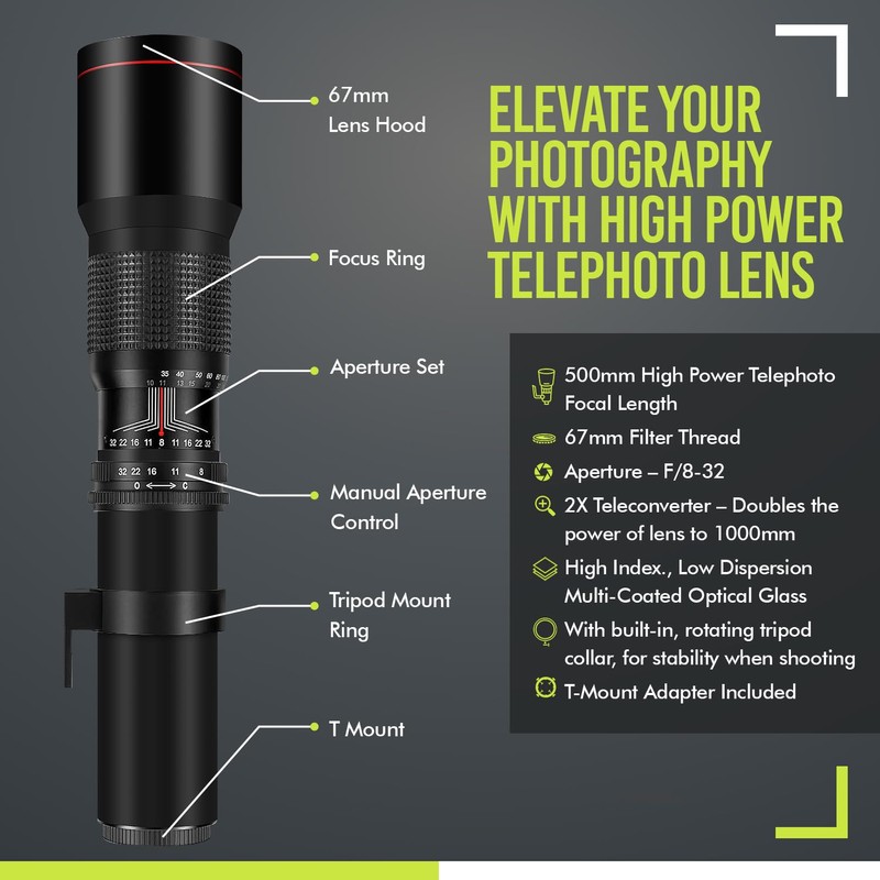 High-Power 500mm/1000mm f/8 Manual Telephoto Lens for Sony Alpha a7 IV, A7C II, a7r, a7R IIIA, a7s, a6400, a6500, a6700, a6300, a6000, a5100, a5000, a3000, NEX-6, NEX-7 E-Mount Cameras
