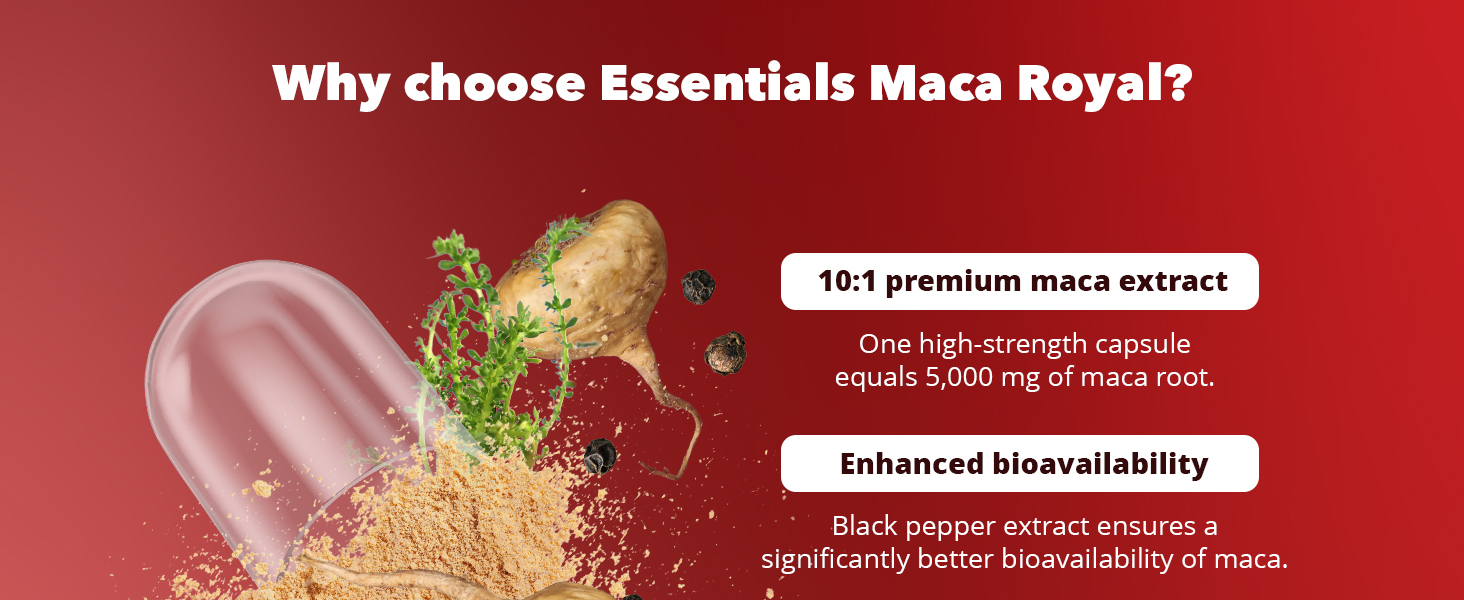 HIGH-STRENGTH MACA EXTRACT: Each capsule delivers 500 mg of potent 10:1 maca root extract, equivalent to 5000 mg of raw maca powder, ensuring maximum efficacy with just one capsule per day.