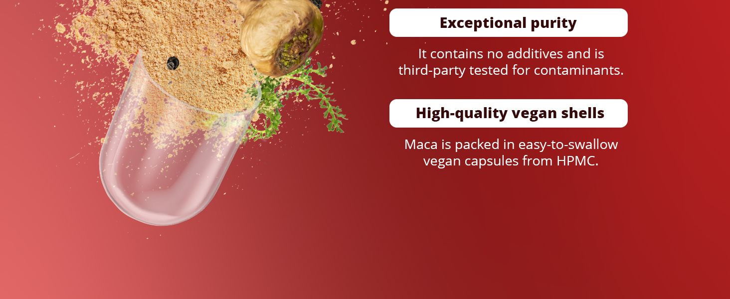 PURE, NATURAL INGREDIENTS: Crafted with care, our maca capsules are free from gluten, lactose, GMOs, allergens, artificial additives, and fillers like microcrystalline cellulose and magnesium stearate. 100% plant-based, they are perfect for vegans and vegetarians.