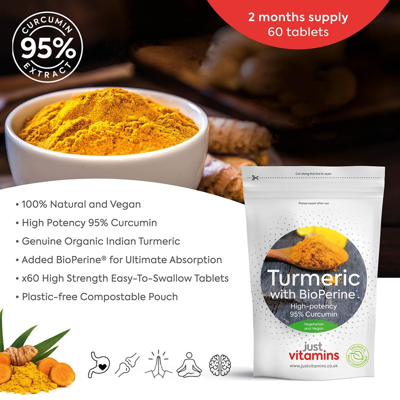 High Strength Turmeric Curcumin 95% + Black Pepper Bioperine® 10,000mg Tablets x60, 2 Month Supply, Advanced Turmeric Supplement with Patented Black Pepper Extract for Max Absorption - UK Made