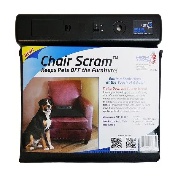 Chair Scram Sonic Scat Pads Instantly activated by the touch of a paw, the battery operated Chair Scram emits startling 85 decibel beeps that get pets off the furniture fast! Pet owners love the Chair Scram because it works quickly and effectively without applying shock or pain to your pet. The Chair Scram works as quickly and effectively as a static shock mat for about 1/2 the price. Because the Chair Scram is non shock it will not hurt your pet. The Chair Scram is made of attractive, easy to clean black nylon exterior.Use the Chair Scram on chairs, in front of doorways, trash cans and of course, it works great on the Chair.