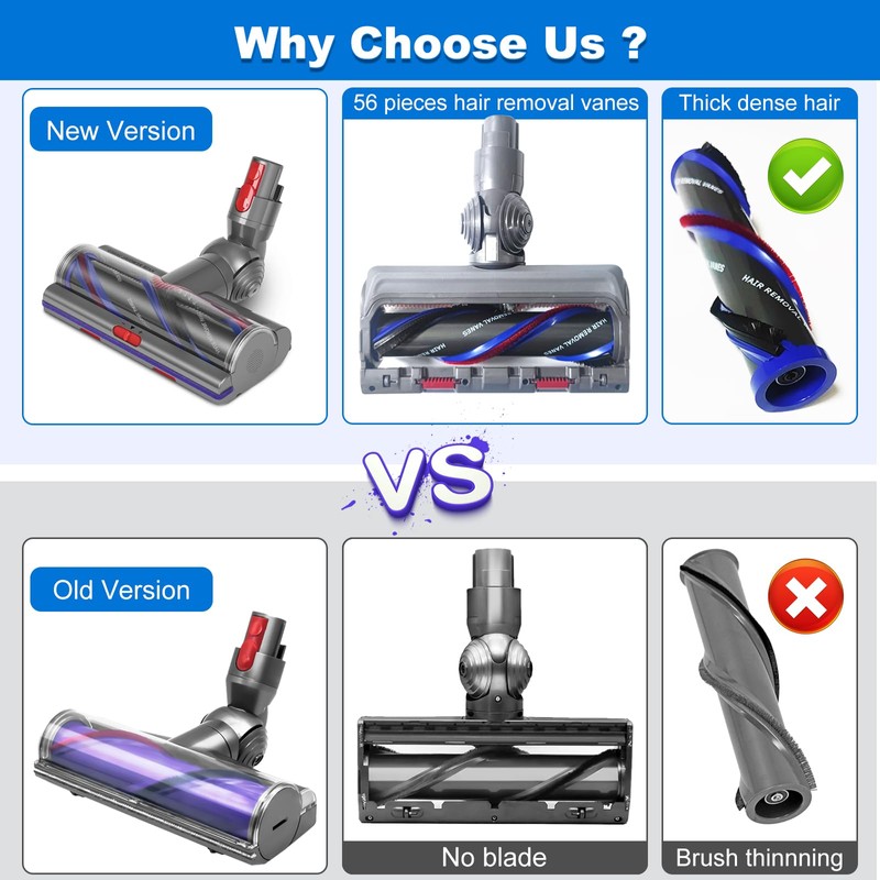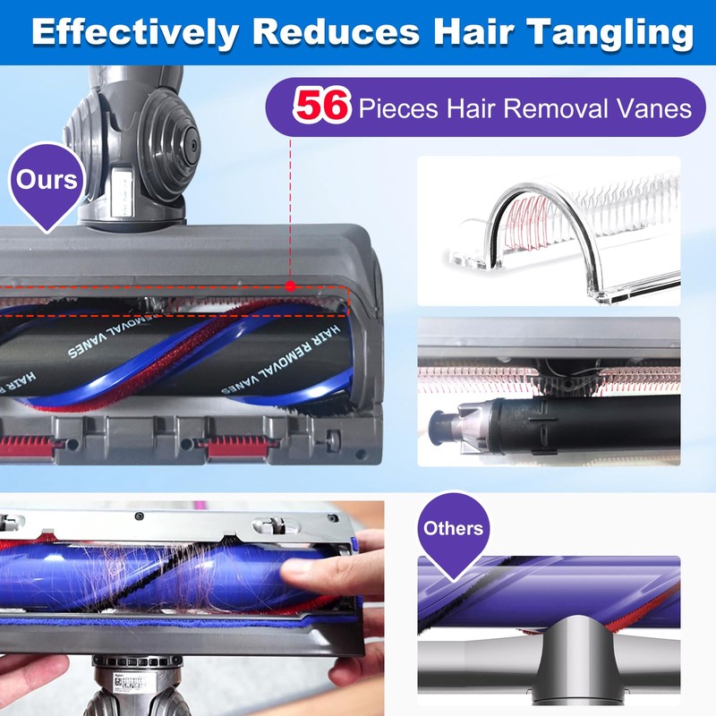 - 【56-Blade Anti-Tangle Tech – Prevent Hair Wrap】Our vacuum head for Dyson features upgraded self-cleaning technology with 56 vanes + 100W high-torque motor to cut pet/long hair tangles by 90%. This Dyson V11 replacement parts compatible brush roll uses nylon bristles for deep carpet cleaning and carbon fiber filaments for hard surfaces.