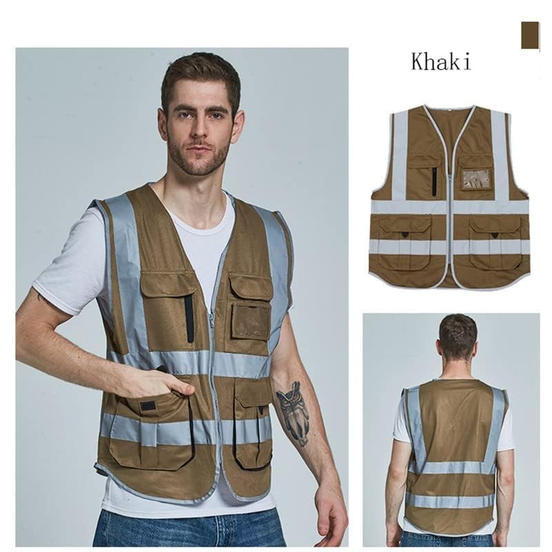 High visibility reflective safety vest multi pockets Hi-vis vest workwear safety waistcoat with reflective strips, Brown, 4X-Large