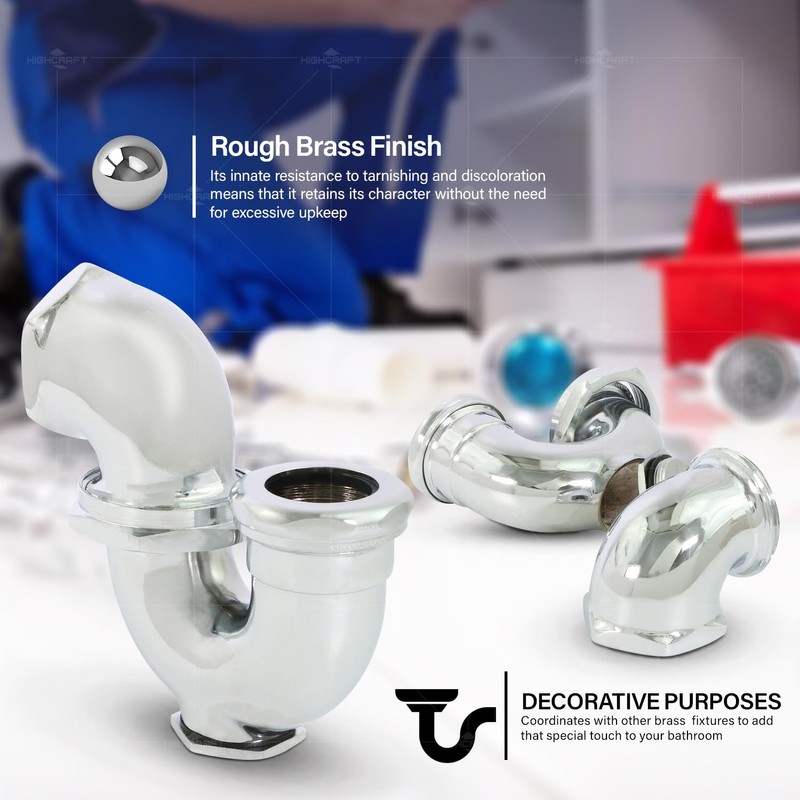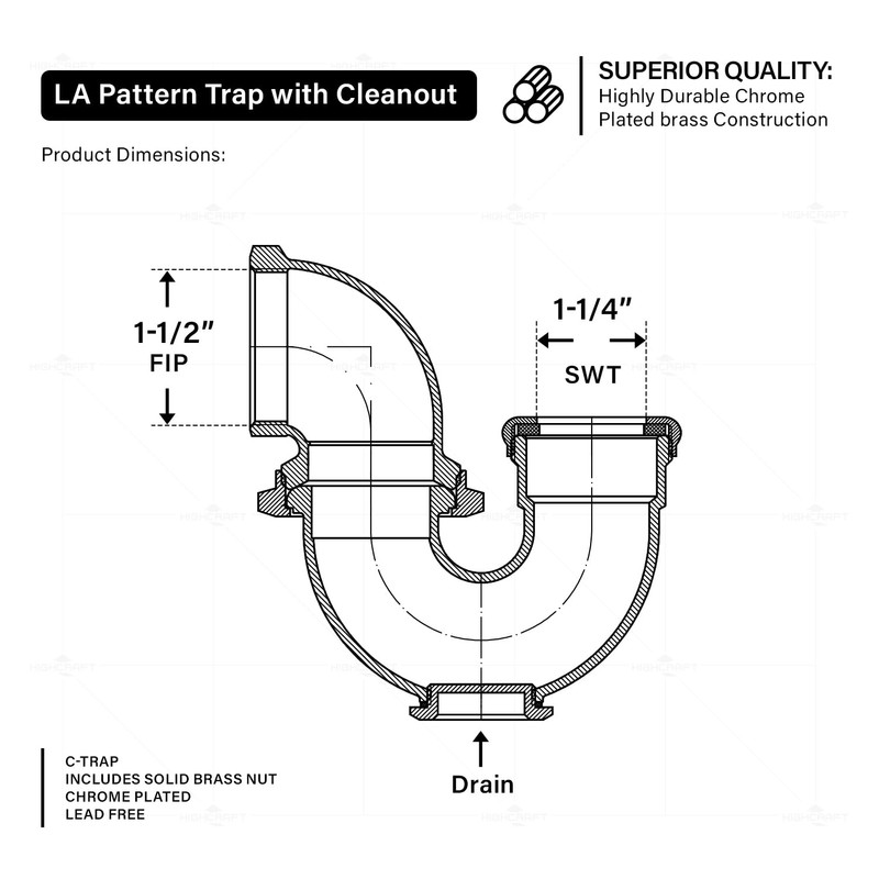 Highcraft Brass Trap LA Pattern Trap 1-1/2" IPS x 1/-1/4" Basin Sink Waste Trap, Chrome Plated Brass Sink Trap for Bathroom Sink, Kitchen Sink, Tubular Drain Applications, Brass Drain Trap w/Nut