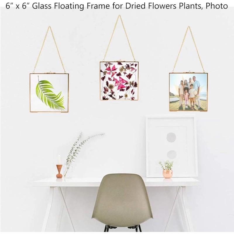 Vintage DesignThis vintage glass handmade hanging photo frames come with a gold chain, it features a classic square design(Size: 6.3*6.3in) which makes it elegant and fashion. | Clear VisionMetal frame and both sides of high definition glass offers a solid construction with pretty appearance. Add a touch of beauty to your room. | Great for DIYJust open the clasp of flower press frame, put photo or plant into,then close the clasp, and hang it. You will get a perfect wall decoration. |