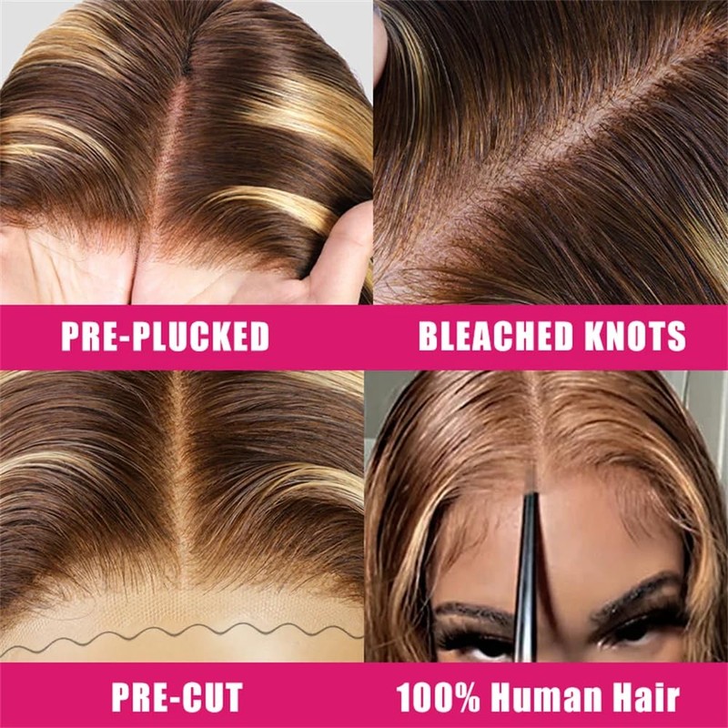 - [5x5 Wear And Go Glueless Bob Wigs Human Hair Lace Design]: Say goodbye to messy adhesives and hello to instant glam! Our brown blonde highligh 5x5 glueless wig revolutionizes convenience with its pre-cut, ready-to-wear lace front—no trimming or glue required. Unlike traditional lace wigs that need careful customization, this innovative design lets you achieve a flawless, natural hairline in seconds, perfect for your on-the-go lifestyle.