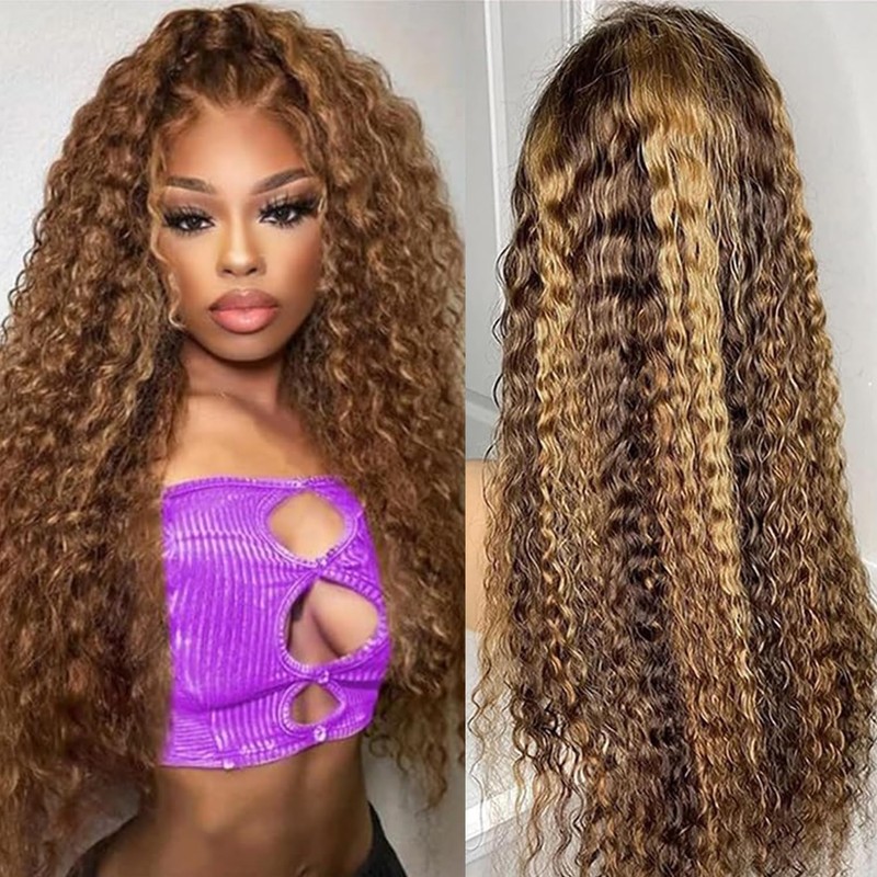 Highlight Ombre Deep Wave Lace Closure Wigs 5x5 Hd Lace Closure Wigs Human Hair Highlight Curly Human Hair Wig Pre Plucked P4/27 Honey Blonde Curly Wigs for Black Women180% Density 30 Inch