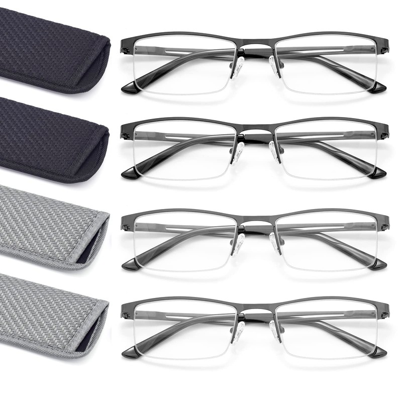 HIGHLIKE 4-Pack Blue Light Reading Glasses for Men, Metal Half Frame Readers Spring Hinge Clear Lens Eyeglasses with Pouches, Semi Rimless 2 Black 2 Gunmetal 1.0 x