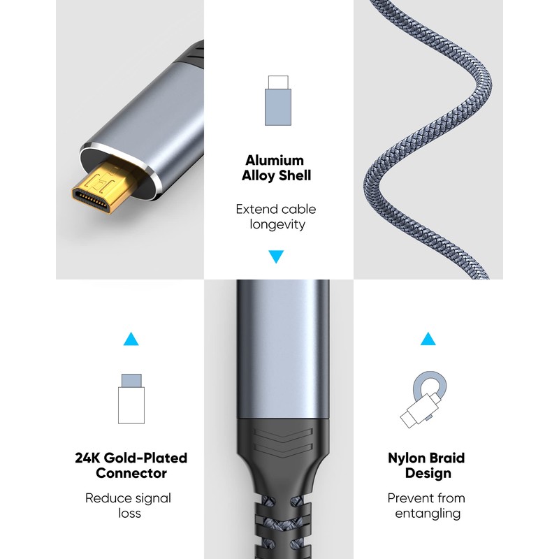 - Durable and portable: With a durable nylon braided and a compact design, this micro HDMI cable is built to withstand everyday wear and tear and is easy to store and transport. Whether you're at home or on the go, this cable is a reliable and convenient solution for connecting your micro HDMI-enabled devices to HDMI 2.0 displays.