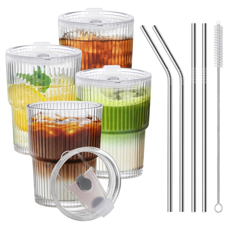- ICED COFFEE CUP SET PACKAGE-The glass cups set include 4 pcs ribbed glass coffee cups, 4 pcs clear plastic lids, 2 pcs straight stainless steel straw, 2 pcs curve stainless steel straw, 1 straw cleaning busher,very practical drinking glasses set