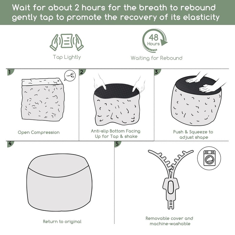 - For convenience and ease of use, this pouf ottoman comes pre-filled with memory foam chunk pouf filler, which can be easily inserted through the large round opening on the bottom with double zippers.