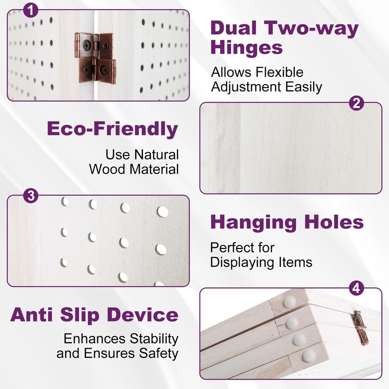 • Pegboard Display Design:This freestanding pegboard divider is an efficient solution for display and partition needs. Acting as a room separator, it allows you to maximize display space by inserting hooks or nails into the small holes, making it an ideal wall divider for room separation. Use it to hang lightweight items like clothes, hats, or bags, adding both functionality and aesthetic appeal to your room dividers and folding privacy screens setup.